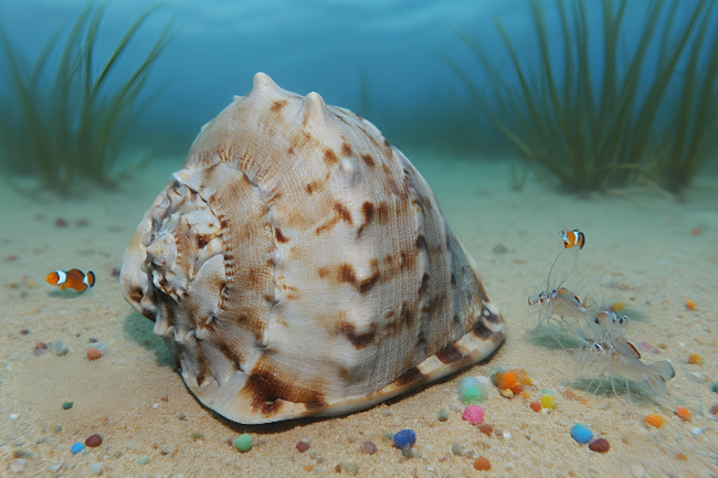 在蓝色的大海里,住着一只叫“蓝蓝”的宝冠螺。它的壳特别神奇,不像小蛤蜊的壳平平无奇,而是像戴着一顶闪闪发光的王冠!