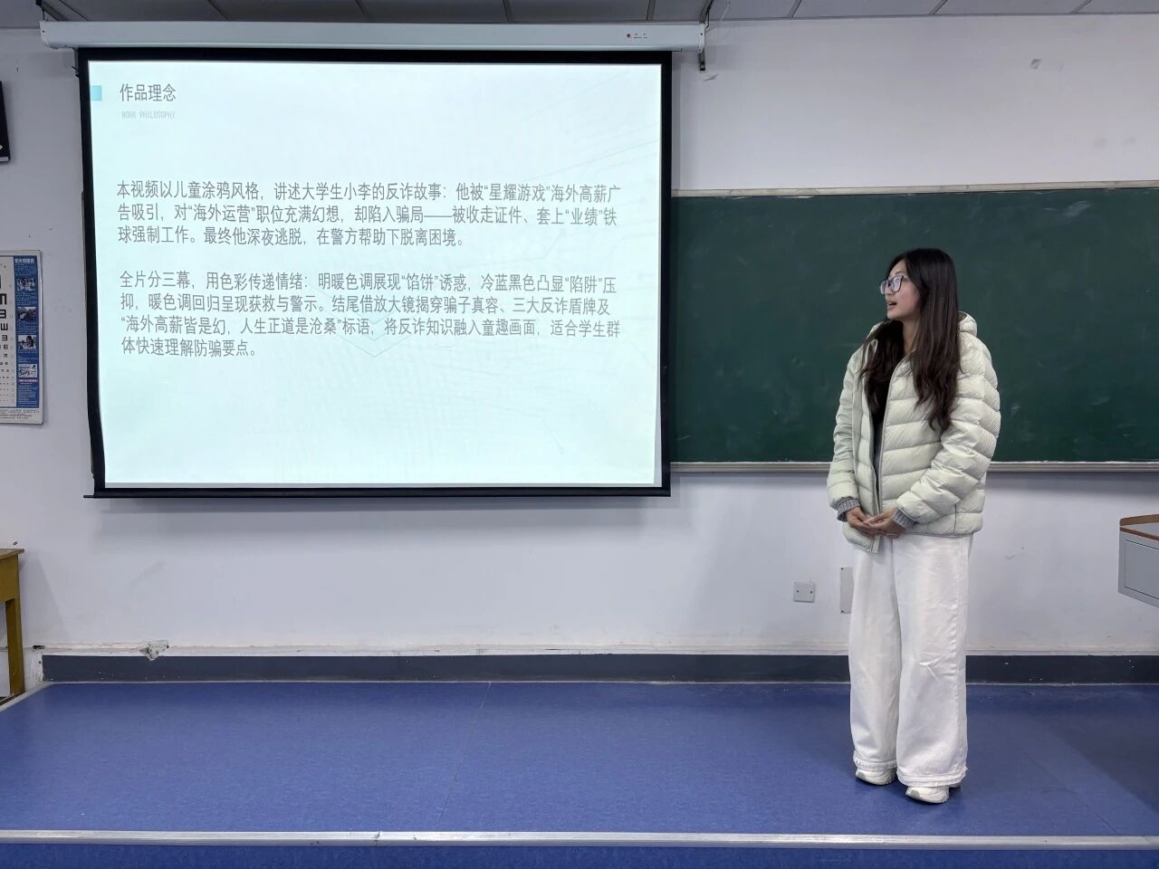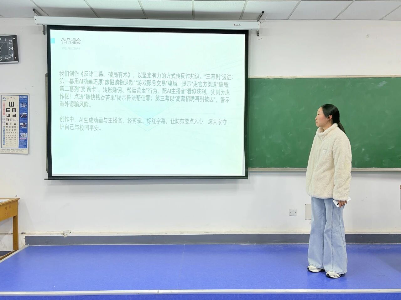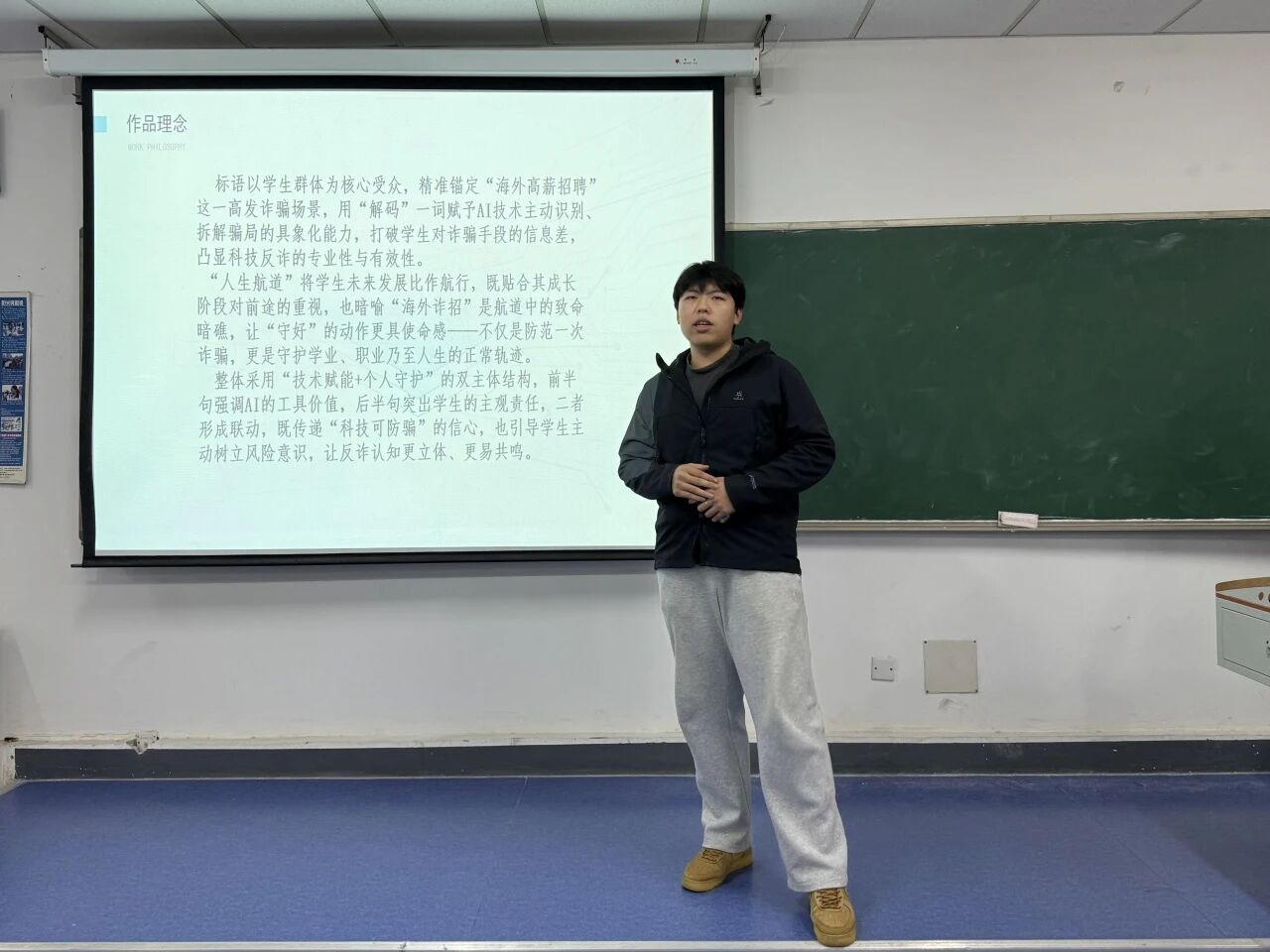 比赛伊始,主持人向同学们展现曾经出现过的复杂多变的诈骗套路,同时阐述本次比赛的目的并宣读比赛要求,详细介绍比赛规则和评分标准。随后,选手们以新颖的AI应用思路和清晰的创意逻辑,将一个个反诈作品生动呈现,既展现了科技的实用价值,也传递了“科技向善”的理念,字里行间满是对筑牢安全防线的思考与热情。