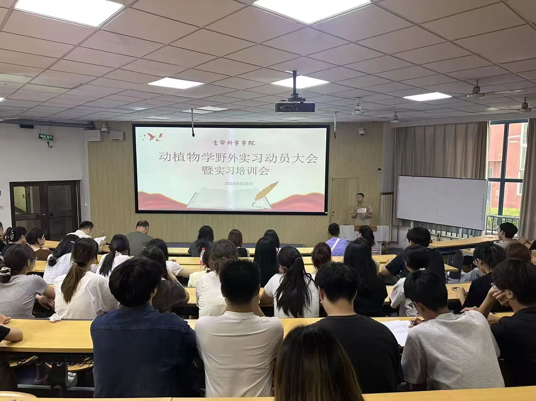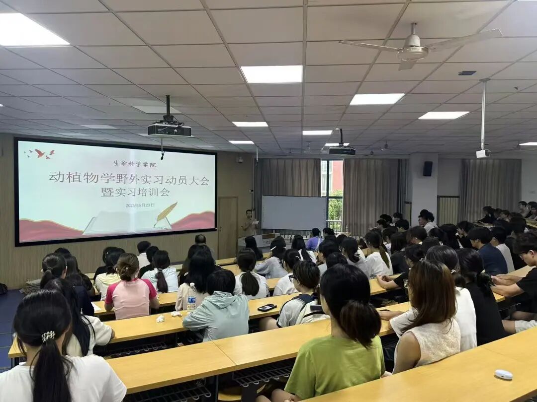 为贯彻落实人才培养方案,提升同学们对动植物学野外实习的认知,做好实习前思想与行动准备,2025年8月23日,生命科学学院于鲲鹏教学楼第一阶梯教室召开生命科学学院2025年学生野外实习动员大会,助力2024级学生动植物学野外实习活动的完成。本次大会由副书记路致远主持,院长王竹承、书记刘汝丰、副院长宋立立、2024级辅导员马馨洁老师、动植物实习专业指导教师李末、孟维悦、王君(大)、张亚楠老师出席,2024级生物科学和生物技术学生参加。