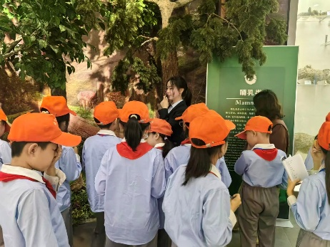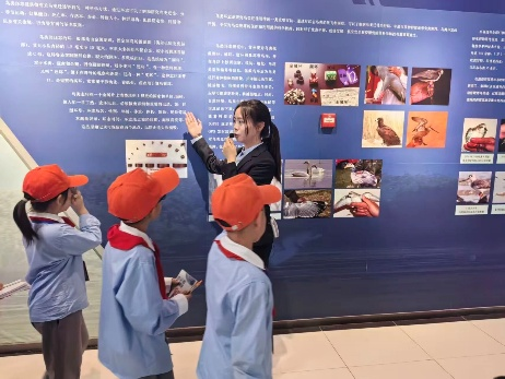 随后,大家前往下一个目的地——生物标本馆。在活动过程中,讲解员带领大家有序进入展厅,依次参观了大鸨区、无脊椎动物区、两栖类、爬行类、哺乳类、鸟类、湿地等展区,并以专业的科学知识引导小学生们的思维,向他们讲解动植物标本的制作过程和这些动植物的自然习性。活动过程中,讲解员呼吁小学生们积极参与野生动物的保护中去,以自身行动助力人与自然和谐共生的美好愿景实现。