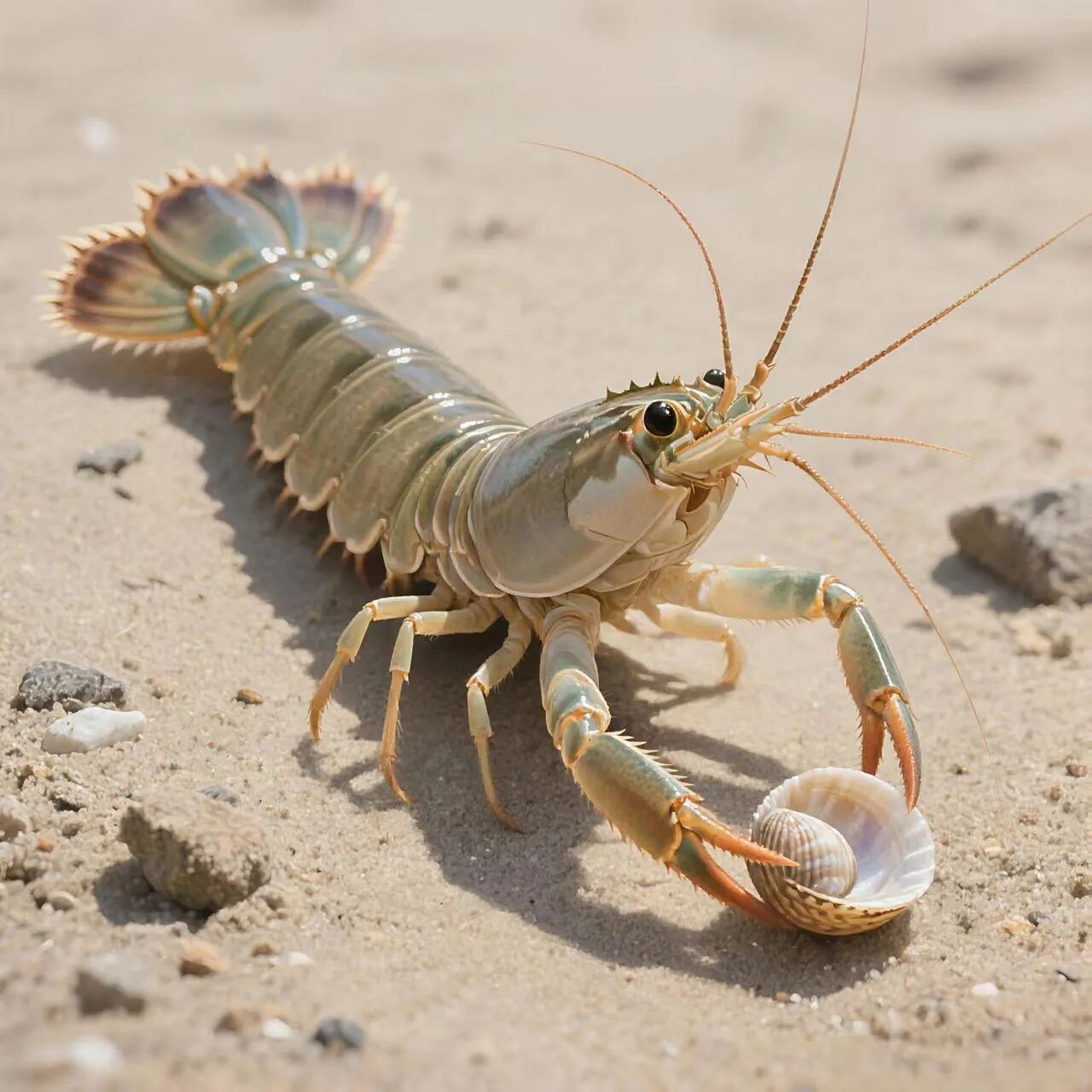 海底沙地里,藏着个“拳击高手”——虾蛄小勇。它的身子披着青褐色的硬壳,最特别的是胸前那对弯弯的“小锤子”,其实是能快速出击的螯足。