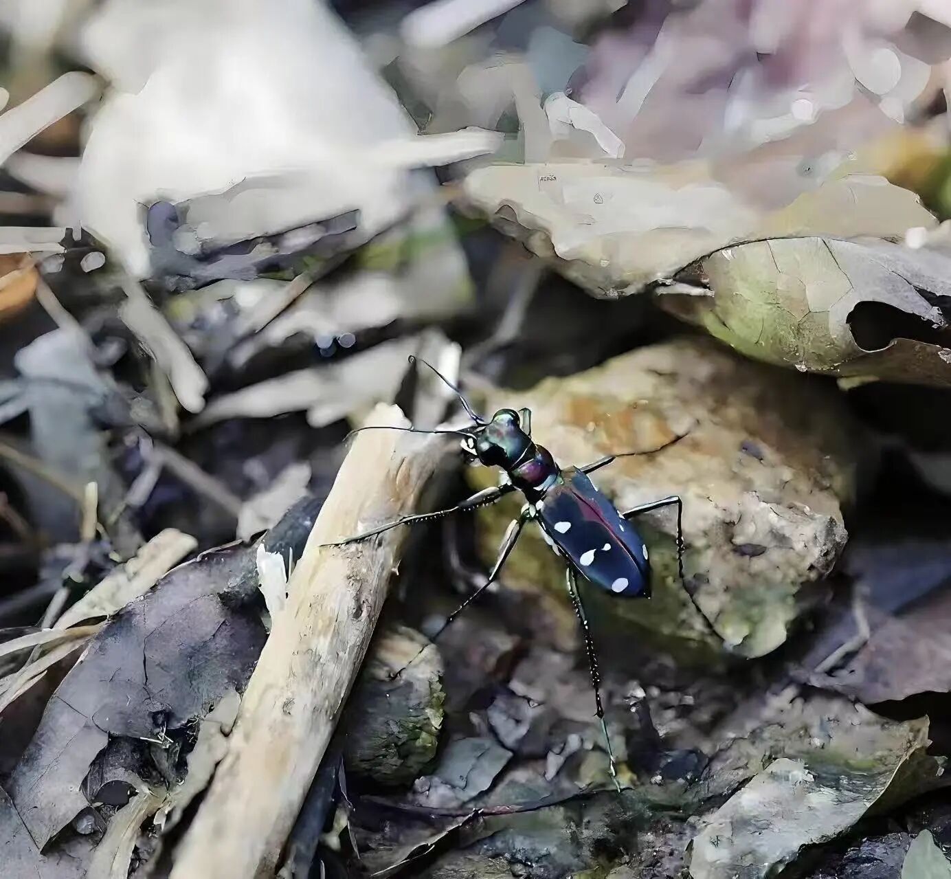 阳光洒满草地,虎斑虎甲闪电正趴在叶片上。它的甲壳金灿灿的,带着黑色斑点,像穿了件威风的铠甲,难怪叫“虎甲”呢!